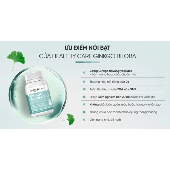 Viên uống Ginkgo Biloba 2000mg Healthy Care là sản phẩm hỗ trợ sức khỏe trí não hàng đầu từ Úc. Được chiết xuất từ lá bạch quả khô tự nhiên, sản phẩm giúp cải thiện lưu thông tuần hoàn máu não, từ đó giải quyết các vấn đề về suy giảm trí nhớ, kém tập trung và mệt mỏi do áp lực công việc.